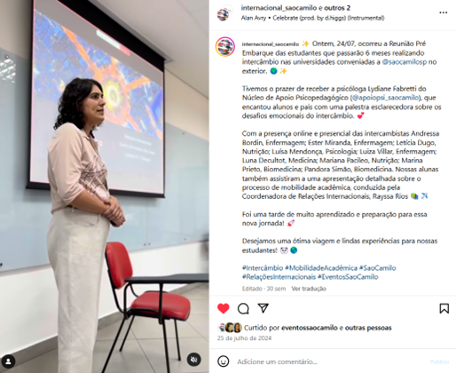 O escopo de atuação mais amplo do Apoio Psicológico e Psicopedagógico é trabalhar em prol da cultura para a saúde mental. Nesse sentido, são estabelecidas diversas parcerias internas com outros setores e núcleos institucionais (administrativos e acadêmicos). Exemplos bem-sucedidos foram: a palestra “Saúde mental na jornada do viajante” (reuniões pré-embarque para intercambistas e familiares, junto ao Núcleo de Relações Internacionais do Centro Universitário São Camilo); mediação de encontros sobre saúde mental, inclusão e diversidade no I Ciclo de Educação Continuada Docente (parceria com o NAPe e o Núcleo de Educação Continuada Docente); aulas sobre primeiros socorros emocionais no curso de formação de socorristas (parceria com o setor de Desenvolvimento de Pessoas e Centro de Simulação Realística); e participação no podcast Biblio Connect, promovido pela equipe das Bibliotecas São Camilo, com o tema saúde mental.